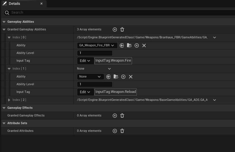 GA_Weapon_Fire_FBR, GA_Weapon_Reload_FBR and GA_ADS will be housed in an AbilitySet_FBR. The AbilitySet_FBR will then be assigned back to the WID_FBR (Equipment Definition).