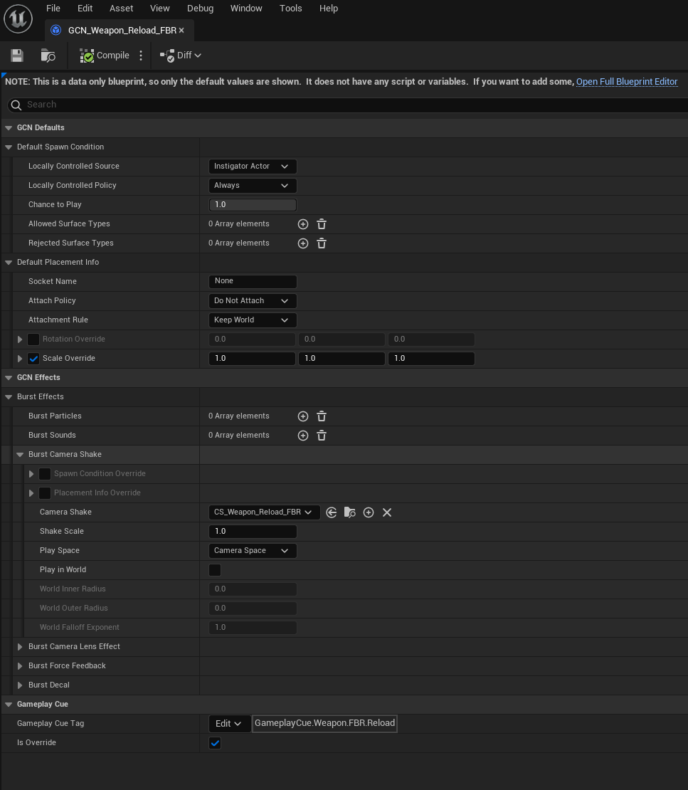The GameplayCue.Weapon.FBR.Reload (Burst) is used to to trigger a Gameplay Cue.