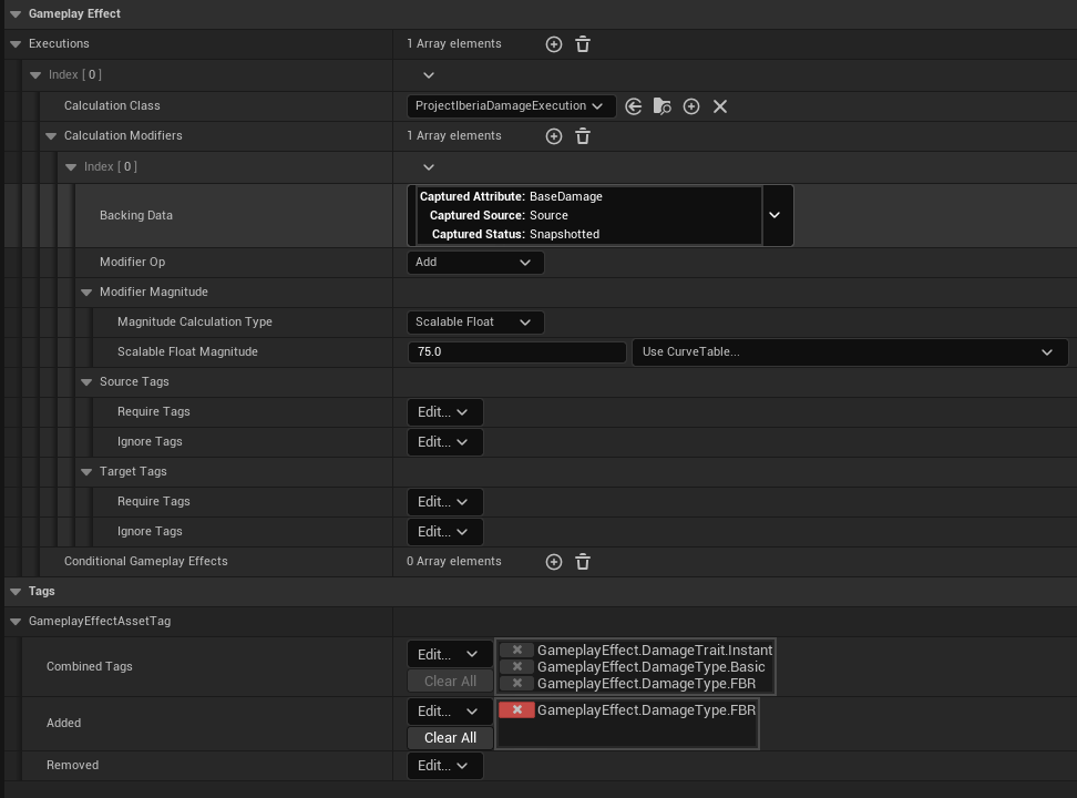 GEDamge - This is all things damage with regards to the FBR (GE_Damage_FBR). Time for a slight detour to explore this GameplayEffect (Shown below is the modified parameters):